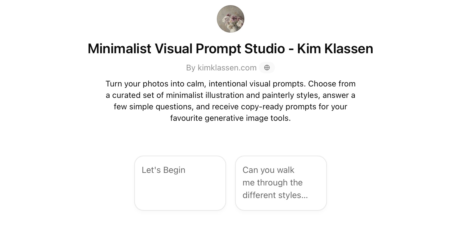 For the Brain, I built a custom tool inside ChatGPT. You upload your photo, choose one of 7 art styles I've curated (soft line and wash, painterly still life, muted Scandinavian, textured letterpress ⋯ ), and it writes the prompt for you. You don't have to guess.